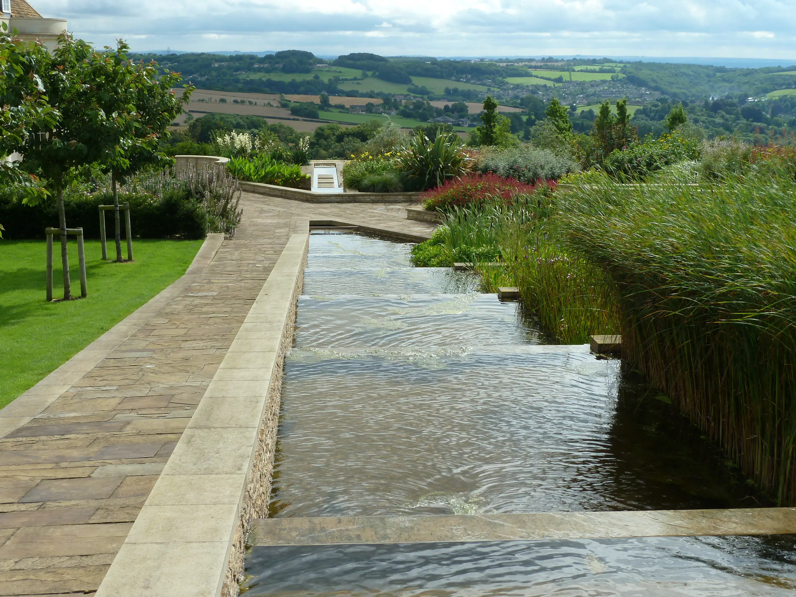 This project was an exciting garden scheme for a new house just outside Bath that replaced a group of redundant farm buildings. Lying on the side of a steep hill, there are magnificent views to the south which informed the design.